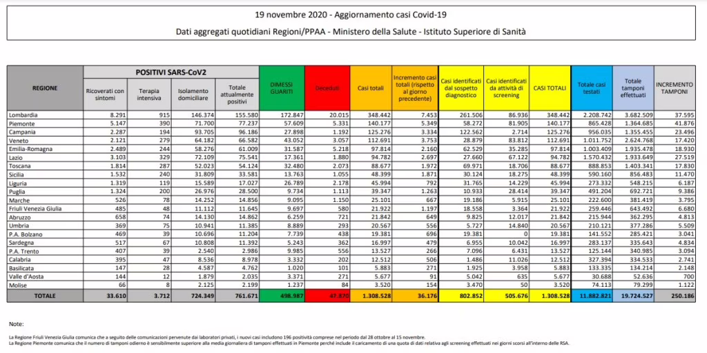 Emergenza Coronavirus, bollettino: i numeri di giovedì 19 novembre