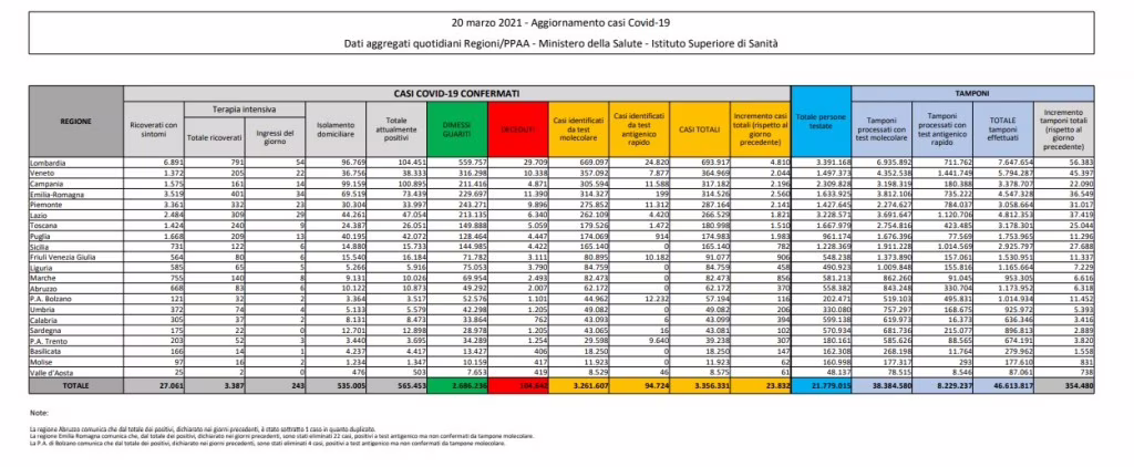 Emergenza Coronavirus, bollettino: i numeri di sabato 20 marzo