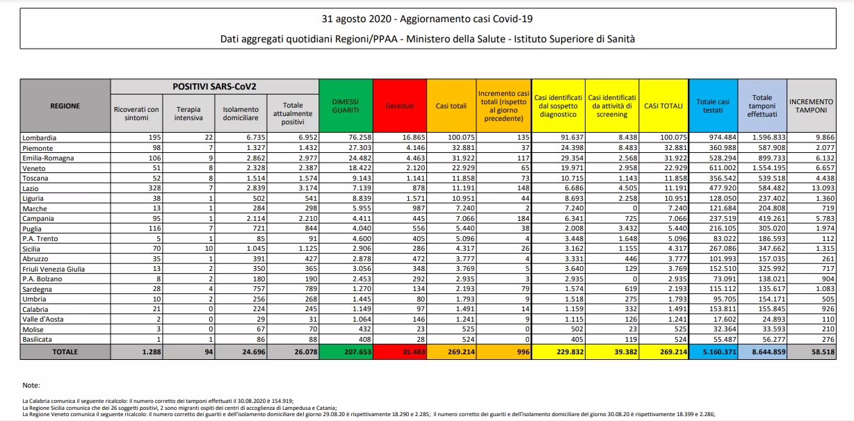 In tutto il Paese, dall’inizio dell’epidemia, 269.214 persone hanno contratto il virus. Di queste, 35.483 sono decedute e 207.653 sono guarite.