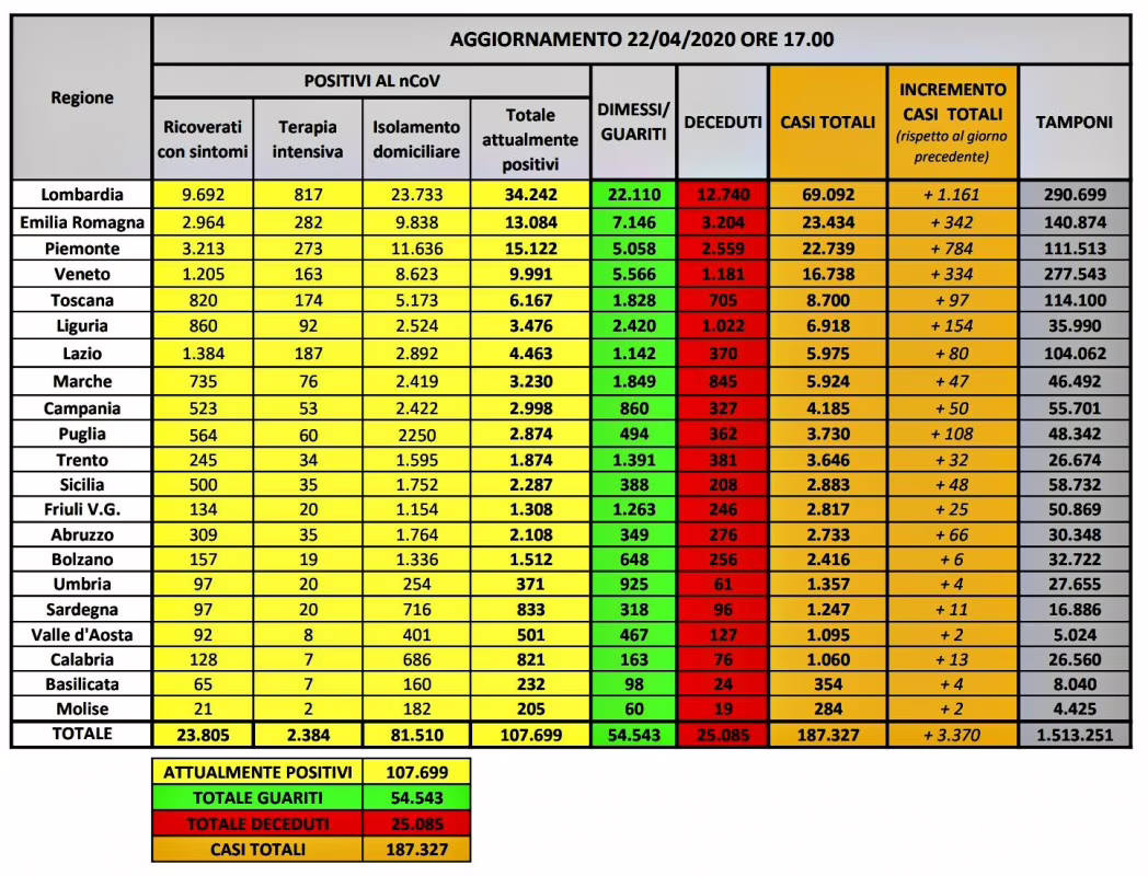 Nel dettaglio: i casi attualmente positivi sono 34.242 in Lombardia, 13.084 in Emilia-Romagna, 15.122 in Piemonte, 9.991 in Veneto, 6.167 in Toscana, 3.476 in Liguria, 3.230 nelle Marche, 4.463 nel Lazio, 2.998 in Campania, 1.874 nella Provincia autonoma di Trento, 2.874 in Puglia, 1.308 in Friuli Venezia Giulia, 2.287 in Sicilia, 2.108 in Abruzzo, 1.512 nella Provincia autonoma di Bolzano, 371 in Umbria, 833 in Sardegna, 821 in Calabria, 501 in Valle d’Aosta, 232 in Basilicata e 205 in Molise.