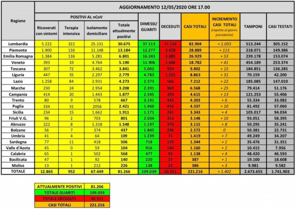 Nel dettaglio: i casi attualmente positivi sono 30.675 in Lombardia, 13.184 in Piemonte, 6.801 in Emilia–Romagna, 5.190 in Veneto, 3.841 in Toscana, 2.779 in Liguria, 4.273 nel Lazio, 3.208 nelle Marche, 1.877 in Campania, 667 nella Provincia autonoma di Trento, 2.421 in Puglia, 1.911 in Sicilia, 801 in Friuli Venezia Giulia, 1.548 in Abruzzo, 437 nella Provincia autonoma di Bolzano, 109 in Umbria, 506 in Sardegna, 104 in Valle d’Aosta, 568 in Calabria, 140 in Basilicata e 226 in Molise.