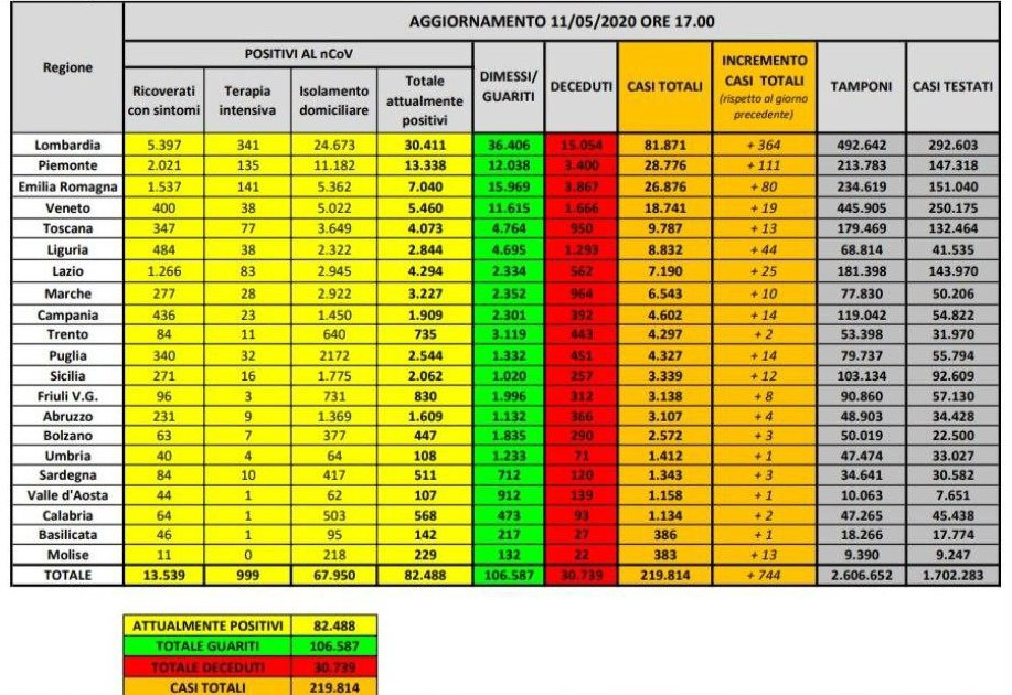 Nel dettaglio: i casi attualmente positivi sono 30.411 in Lombardia, 13.338 in Piemonte, 7.040 in Emilia–Romagna, 5.460 in Veneto, 4.073 in Toscana, 2.844 in Liguria, 4.294 nel Lazio, 3.227 nelle Marche, 1.909 in Campania, 735 nella Provincia autonoma di Trento, 2.544 in Puglia, 2.062 in Sicilia, 830 in Friuli Venezia Giulia, 1.609 in Abruzzo, 447 nella Provincia autonoma di Bolzano, 108 in Umbria, 511 in Sardegna, 107 in Valle d’Aosta, 568 in Calabria, 142 in Basilicata e 229 in Molise.