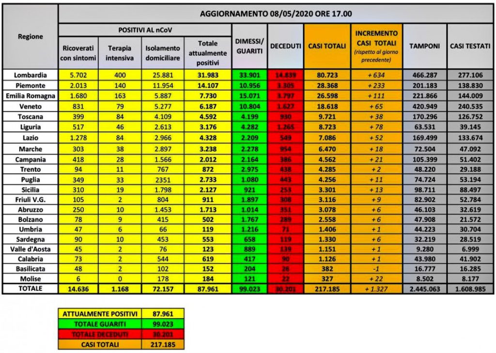 Nel dettaglio: i casi attualmente positivi sono 31.983 in Lombardia, 14.107 in Piemonte, 7.730 in Emilia–Romagna, 6.187 in Veneto, 4.592 in Toscana, 3.176 in Liguria, 4.328 nel Lazio, 3.238 nelle Marche, 2.012 in Campania, 872 nella Provincia autonoma di Trento, 2.733 in Puglia, 2.127 in Sicilia, 911 in Friuli Venezia Giulia, 1.713 in Abruzzo, 502 nella Provincia autonoma di Bolzano, 119 in Umbria, 553 in Sardegna, 123 in Valle d’Aosta, 619 in Calabria, 152 in Basilicata e 184 in Molise.