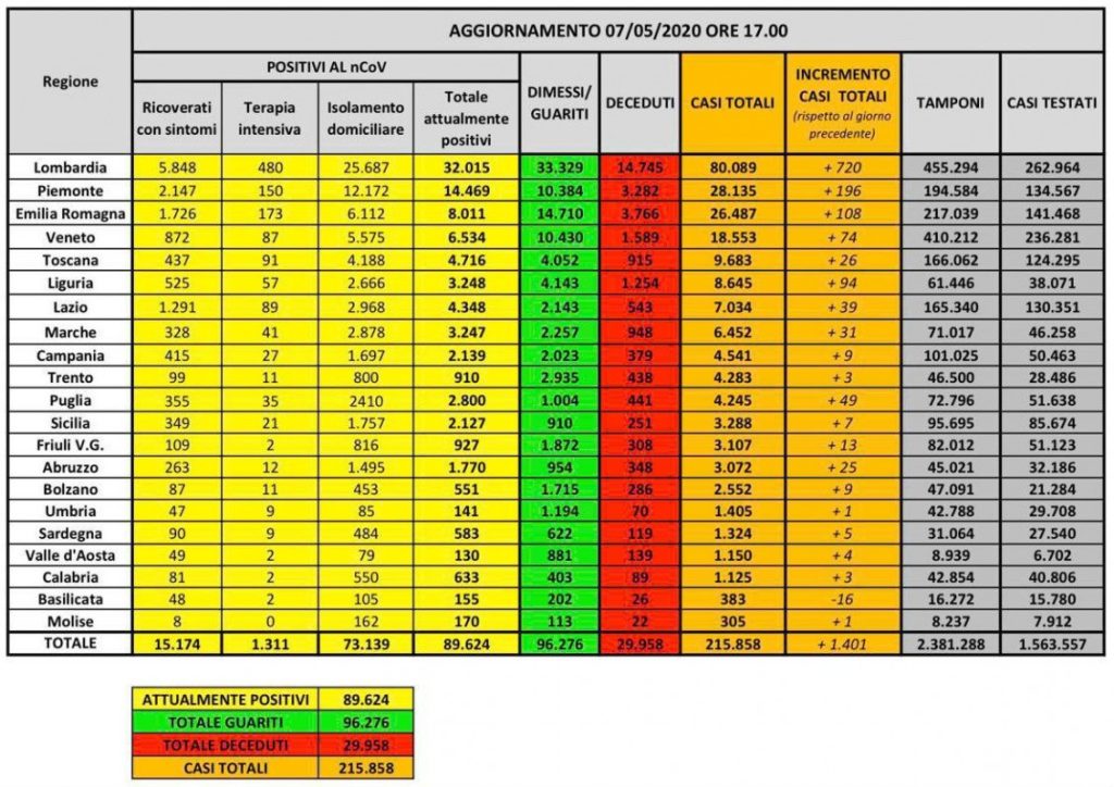 Nel dettaglio: i casi attualmente positivi sono 32.015 in Lombardia, 14.469 in Piemonte, 8.011 in Emilia–Romagna, 6.534 in Veneto, 4.716 in Toscana, 3.248 in Liguria, 4.348 nel Lazio, 3.247 nelle Marche, 2.800 in Puglia, 2.139 in Campania, 2.127 in Sicilia, 1.770 in Abruzzo, 910 nella Provincia autonoma di Trento, 927 in Friuli Venezia Giulia, 633 in Calabria, 583 in Sardegna, 551 nella Provincia autonoma di Bolzano, 170 in Molise, 155 in Basilicata, 141 in Umbria e 130 in Valle d’Aosta.