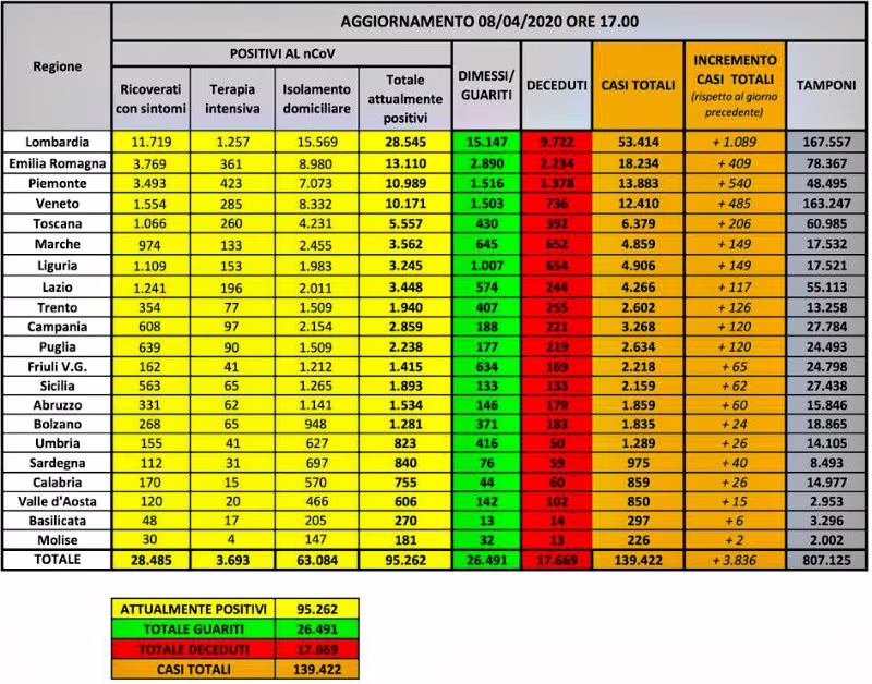 In tutto il Paese, dall’inizio dell’epidemia, 139.422 persone hanno contratto il virus. Di queste, 17.669 sono decedute e 26.491 sono guarite.