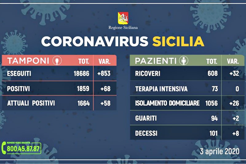 Sono in totale 1.859 (+68 rispetto a ieri) le persone contagiate dal CoronaVirus in Sicilia dall’inizio della pandemia. Questo quanto si apprende dalla Regione Siciliana attraverso il suo ultimo bollettino: gli attualmente positivi sono 1.664 persone (+58 rispetto a ieri), 608 (+32) i pazienti ricoverati, di cui 73 (0) in terapia intensiva mentre 1.056 (+26) sono in isolamento domiciliare; 94 (+2) i guariti e 101 (+8) i deceduti.