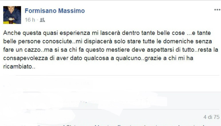 Massimo Formisano, esonerato ieri dal Città di Sant’Agata, ha espresso su Facebook il proprio pensiero: “Anche questa quasi esperienza mi lascerà dentro tante belle cose e tane belle persone. Mi dispiacerà solo stare tutte le domeniche senza fare un ca**o, ma si sa che chi fa questo mestiere deve aspettarsi di tutto. Resta la consapevolezza di aver dato qualcosa a qualcuno, grazie a chi mi ha ricambiato…”.