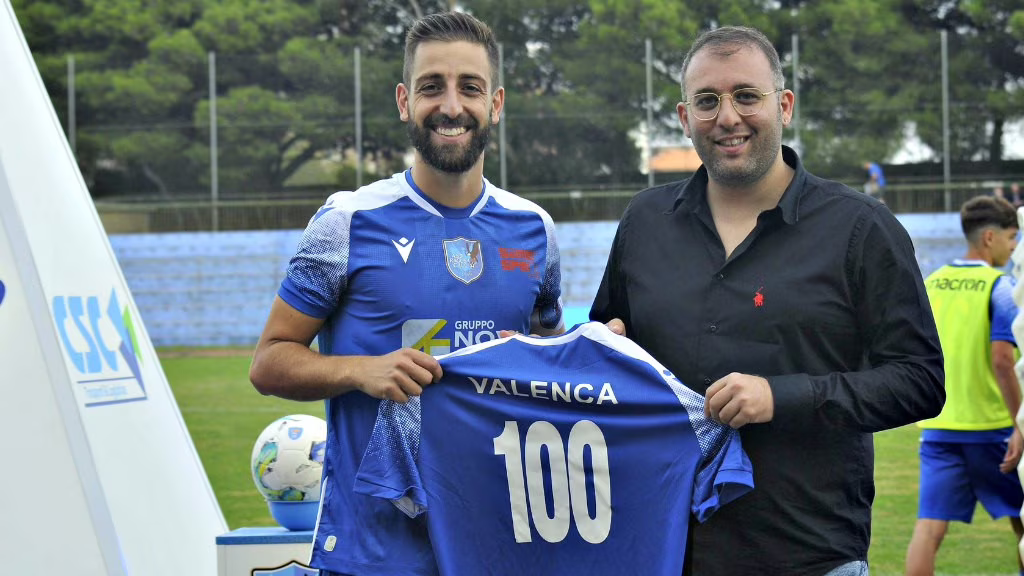 Il presidente del Ragusa, Giacomo Puma, prima della gara contro il Sant’Agata ha premiato il capitano David Floro Valenca, alla centesima presenza, in maglia azzurra: