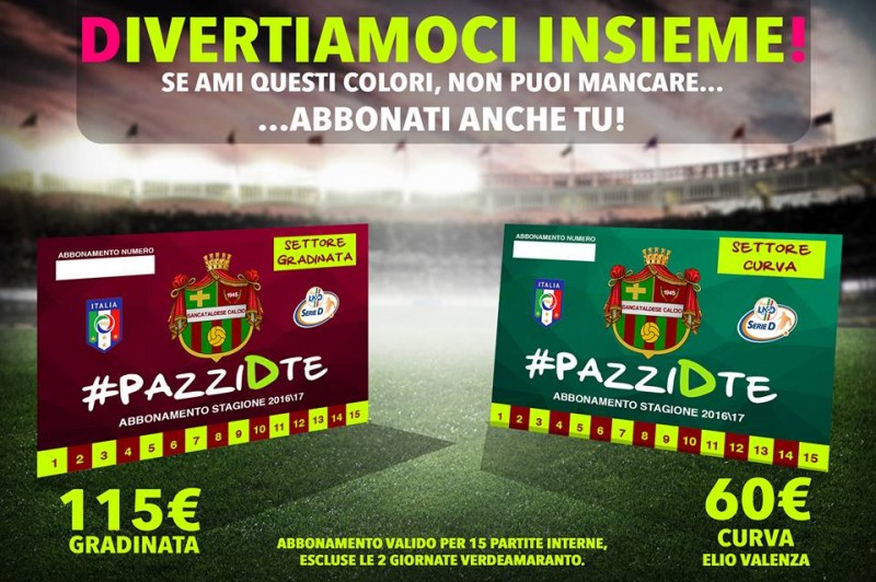 Dopo l’ufficialità del ripescaggio in serie D, partirà domani la campagna abbonamenti della Sancataldese in vista della stagione 2016/17. Questi i prezzi: