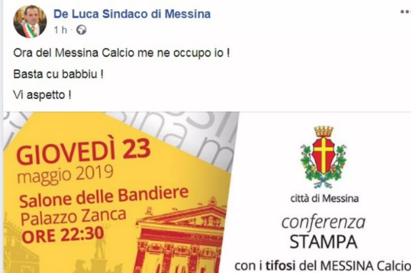 Cateno De Luca, sindaco di Messina, con un post sui social ha annunciato per domani una conferenza a Palazzo Zanca (dalle ore 22.30) con i supporters biancoscudati. Citate nell’annuncio anche Camaro e Città di Messina. Questo il breve ma chiaro comunicato: “Ora del Messina calcio me ne occupo io. Basta cu babbiu! Vi aspetto”.